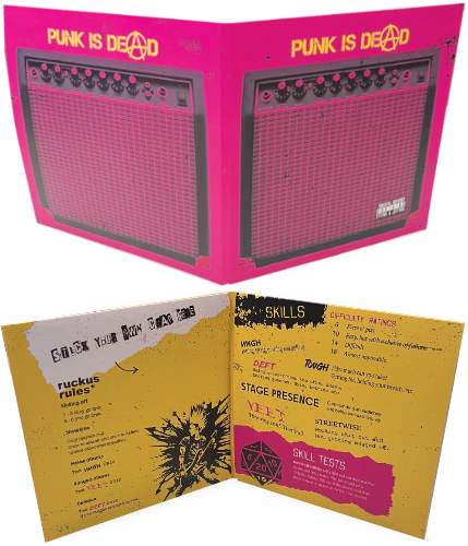 The official Band Manager screen for the Punk is Dead TTRPG. A seven-inch gatefold with Pantone colours to match the game book, handy reference on the BM facing side and sleeve to store notes or extend the screen.